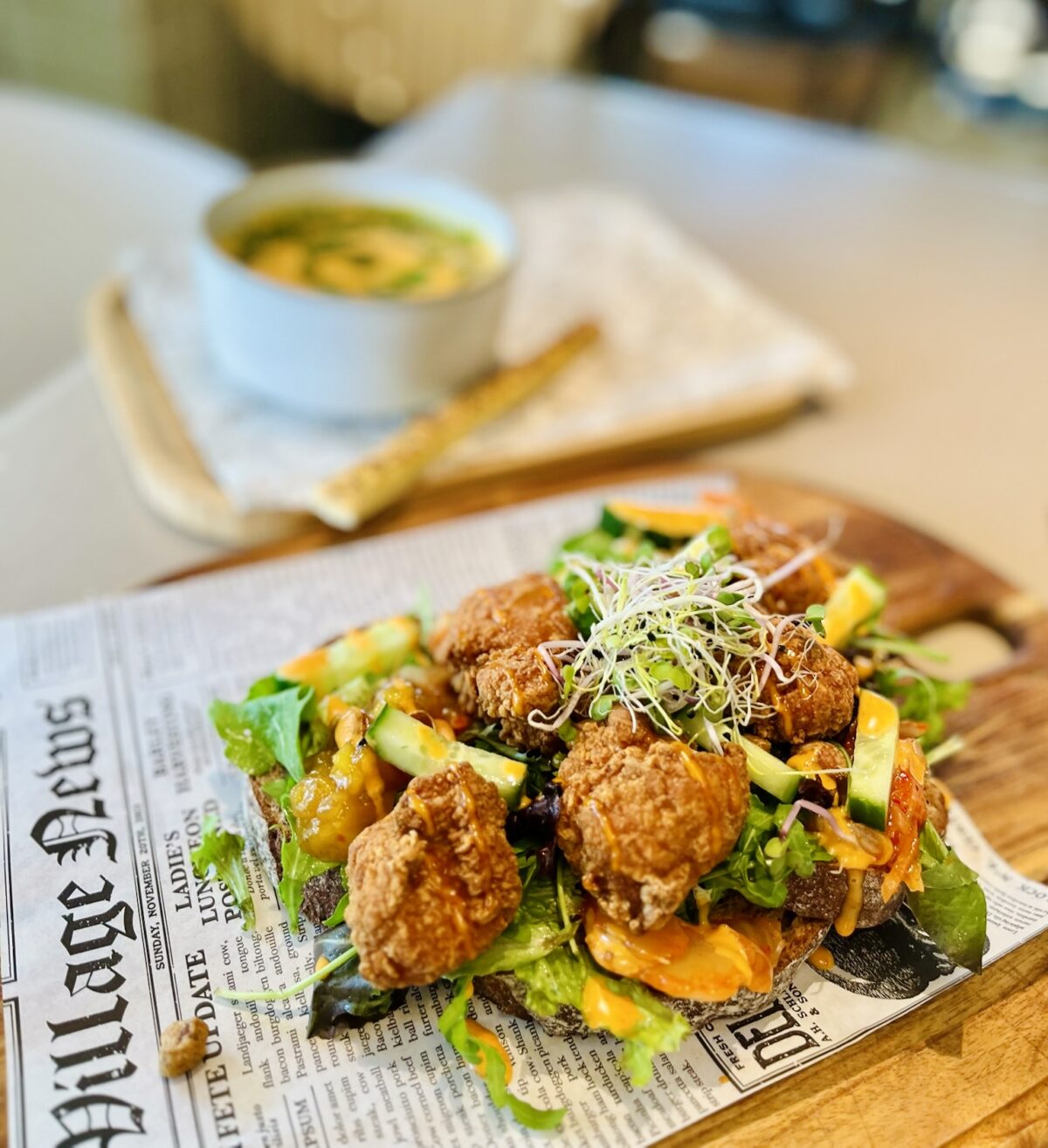 Op de afbeelding zie je onze nieuwe lunchspecial ‘broodje krokante kip’ met karage, kimchi, komkommer, katjang pedis en siracha mayonaise. Ook onze heerlijke seizoensoep ‘zoete aardappel’ is nieuw! Standaard met gerookte kip, maar ook natuurlijk ook zonder gerookte kip te bestellen.